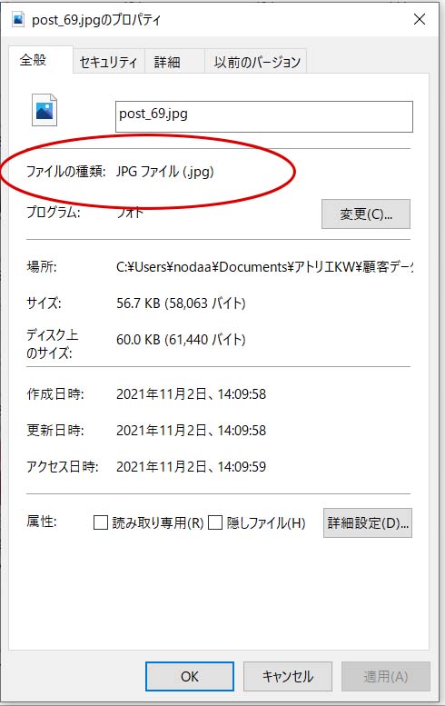 もしファイル名が ○○○○.jpg となっていたら、JPEG形式の画像ファイルです。