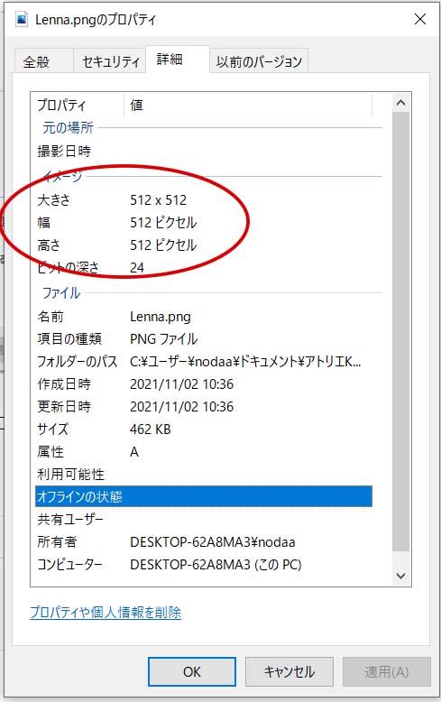 下の例ですと、幅 512ピクセル、高さ 512ピクセルの画像であることが分かります。