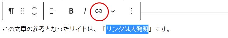 リンクを設定したい文字を選択します。その状態で、上に表示されるメニューから、鎖のマークをクリックします。