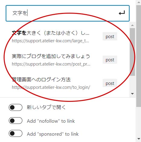 同じサイト内の場合は、リンクしたいページのタイトルの一部を入力すると候補が出てきます。
