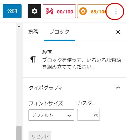 ブログ作成画面の右の縦3つの点のところをクリックします。
