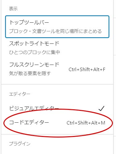 そうすると、下のようなメニューが現れます。このメニューのコードエディターをクリックします。