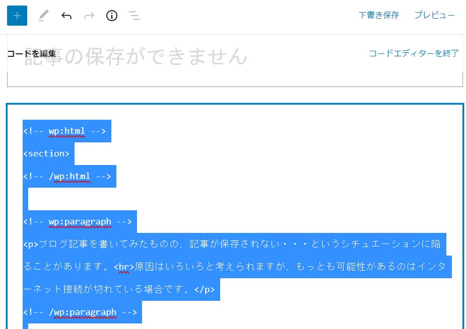 作成中のブログ記事を丸ごと保存するために、コードエディターを使用します。