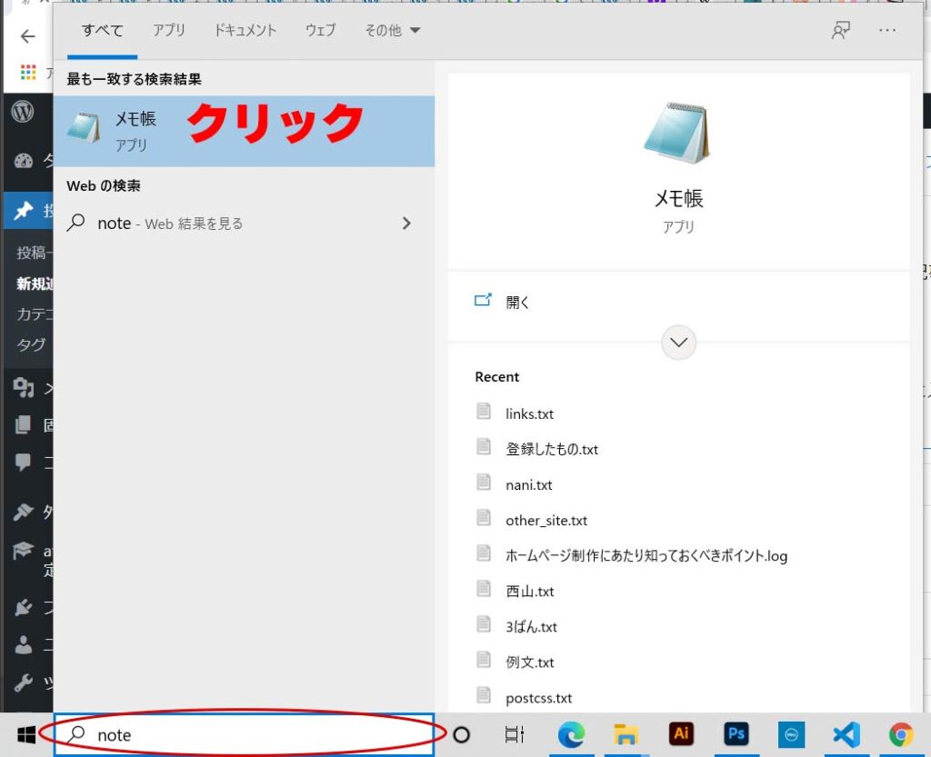 Windows の場合は、Windows のタスクバーの 「ここに入力して検索」のところに、 note と入力すると、メモ帳が現れますので、クリックして開きます。