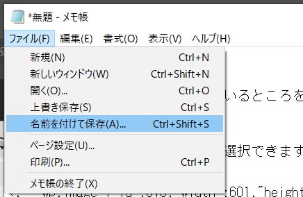 メモ帳のメニュー「ファイル」→「名前を付けて保存」を選択。