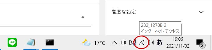 パソコンのタスクバーのネットワークの状態を確認します。Windows の場合画面の右下です。