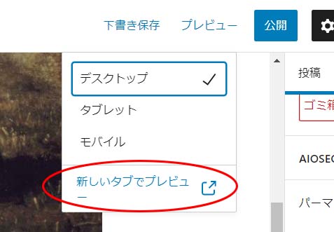 画面上部メニューの「下書き保存」をクリックしたのちに、「プレビュー」をクリックします。